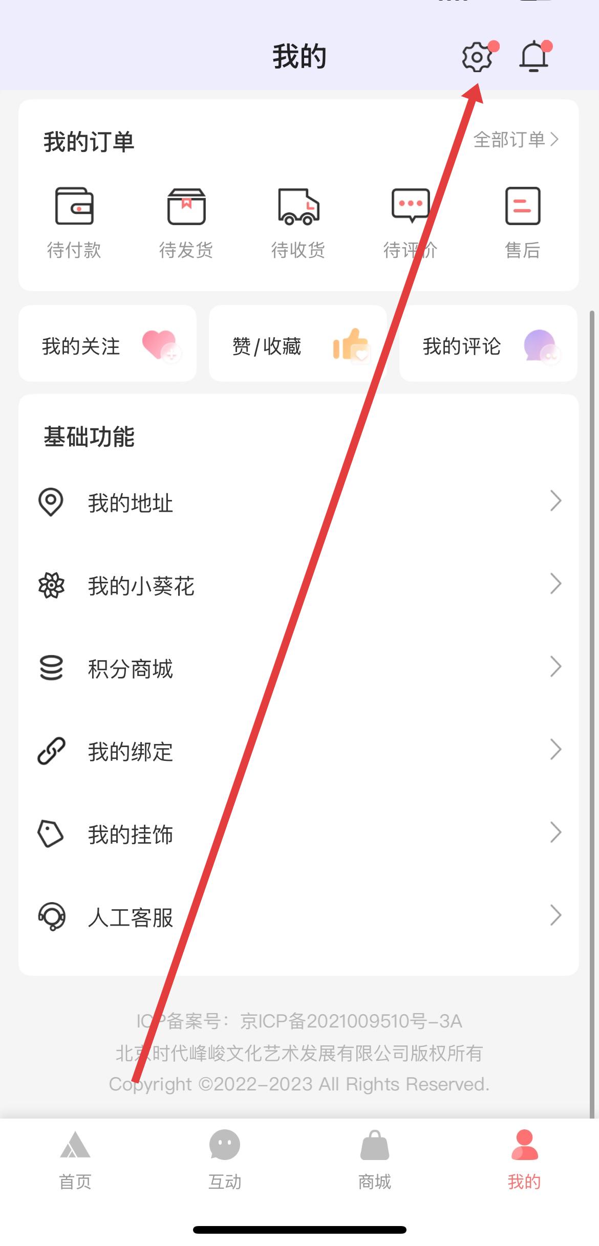 1、打开tf家族Fanclub软件,点击右下角我的,进入个人页面后,点击右上角齿轮形状的设置图标。