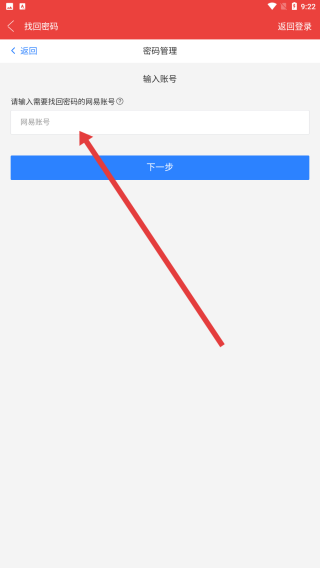 3、在密码管理页面的输入框中填写需找回密码的网易账号,准备进行下一步操作。
