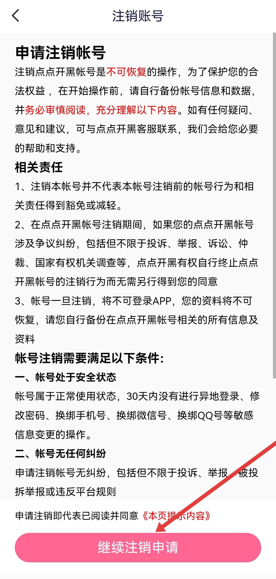 3、在注销账号说明页面,点击继续注销申请按钮,进入验证环节。