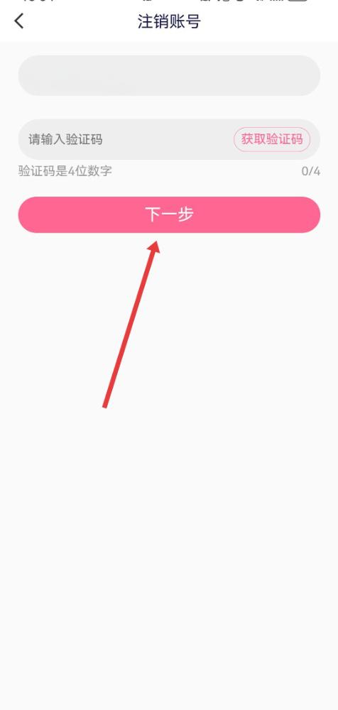 4、在验证页面输入手机号及验证码后,点击下一步完成账号注销申请流程。