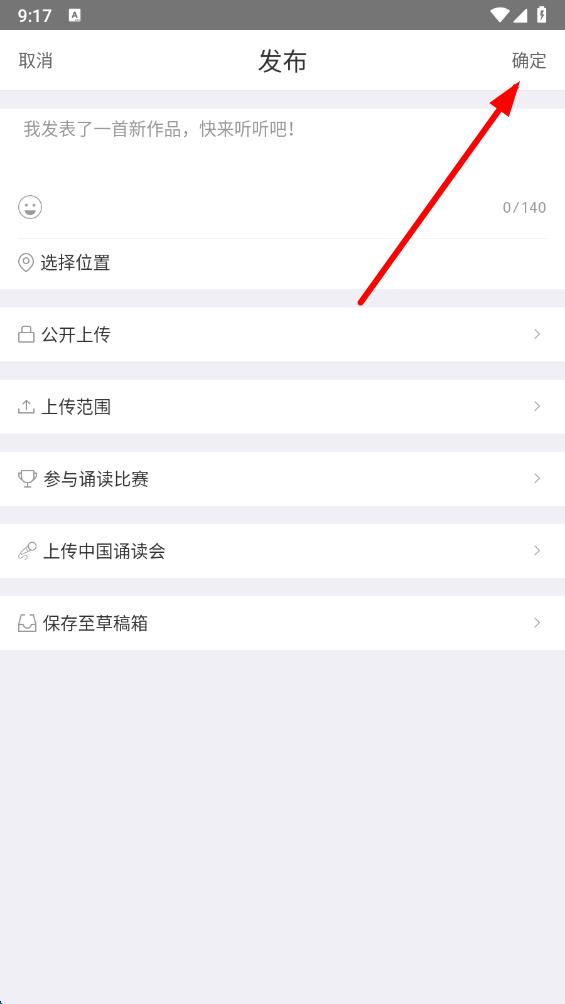 4、在发布界面,可以添加描述、选择位置、设置上传范围等,确认信息无误后,点击确定即可发布自己的K诗作品。