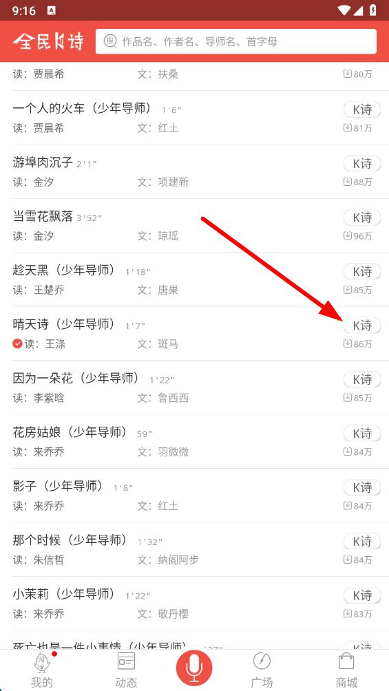 2、在诗歌选择界面,浏览并找到想要朗读的诗歌,点击该诗歌右侧的K诗按钮,进入录制界面。