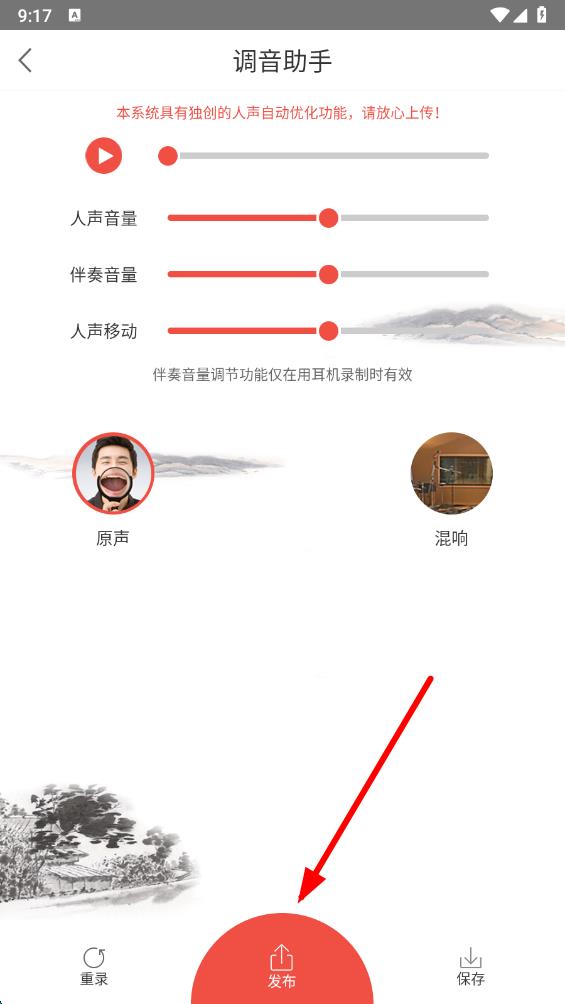 3、完成诗歌朗读录制后,利用调音助手调整人声音量、伴奏音量等参数,调整完毕点击发布按钮。