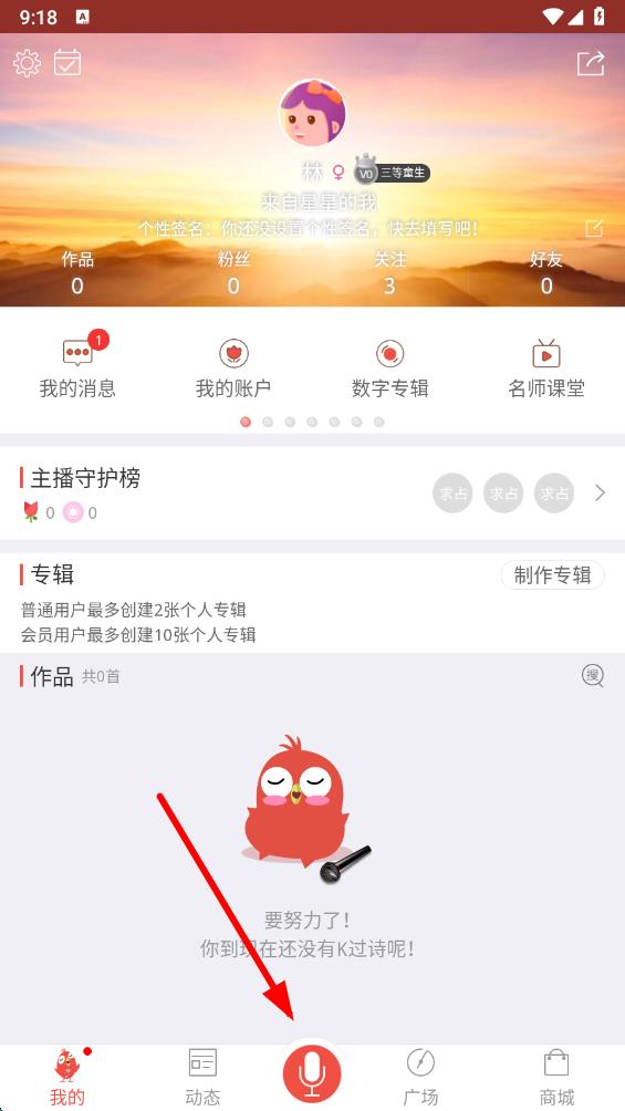 1、打开全民K诗APP,点击底部导航栏中间的红色麦克风图标,进入诗歌选择界面。