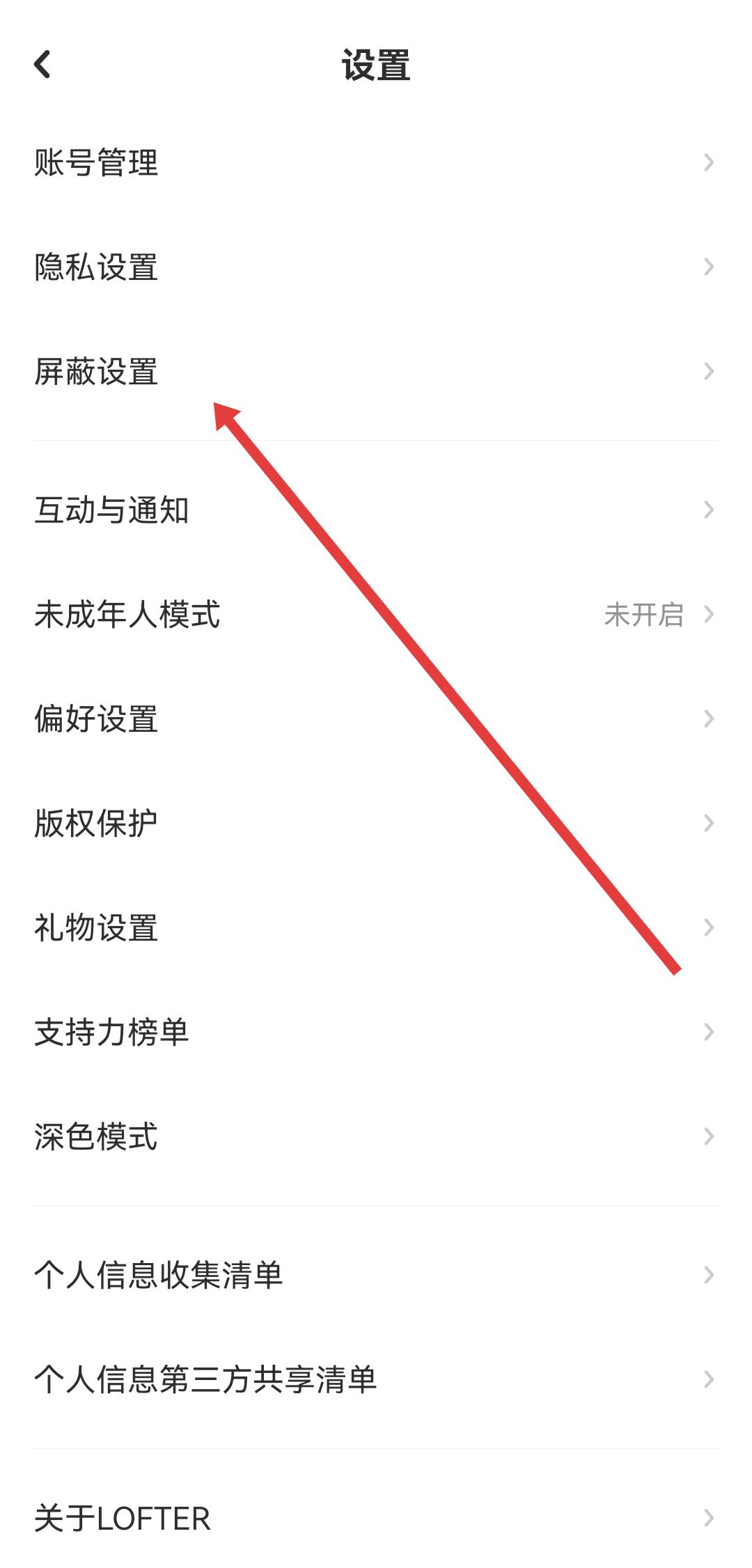 2、在个人账号设置的页面中,需要找到并点击屏蔽设置的选项,然后进入屏蔽设置的界面。