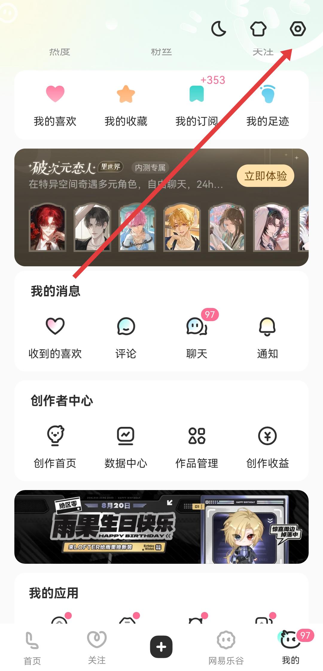 1、打开LOFTER,点击底部导航栏中的我的选项,进入个人中心页面,再点击页面右上角的齿轮形状设置图标。