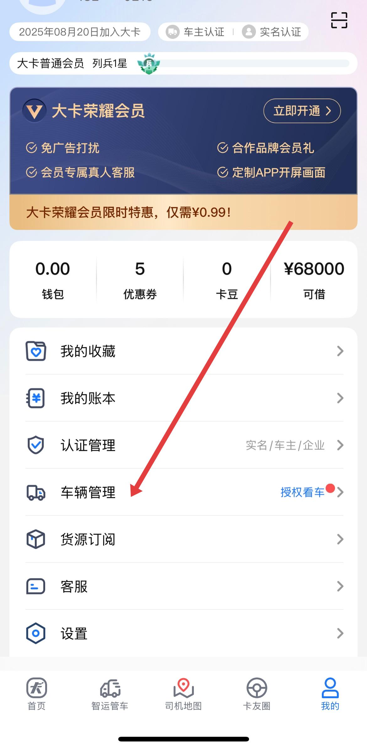 1、打开车旺大卡APP,进入我的页面,在我的页面里,找到认证管理下方的车辆管理选项并点击进入。