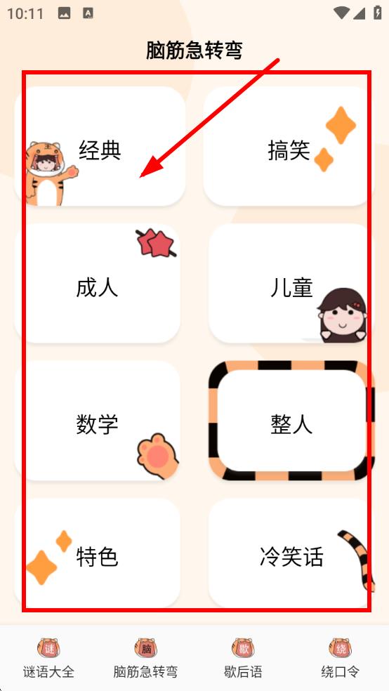 2、切换到【脑筋急转弯】页,点击【经典】【搞笑】【成人】等分类,进入不同风格脑筋急转弯内容,挑战思维。