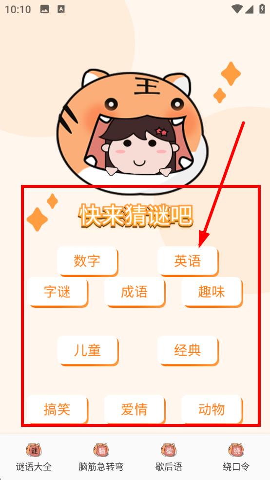 1、打开谜语大全界面,在【快来猜谜吧】板块,按需选择【数字】【英语】【字谜】等分类,进入对应谜题类型页面猜谜。