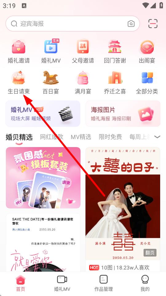 1、打开婚贝请柬App,在首页点击生日请柬选项。