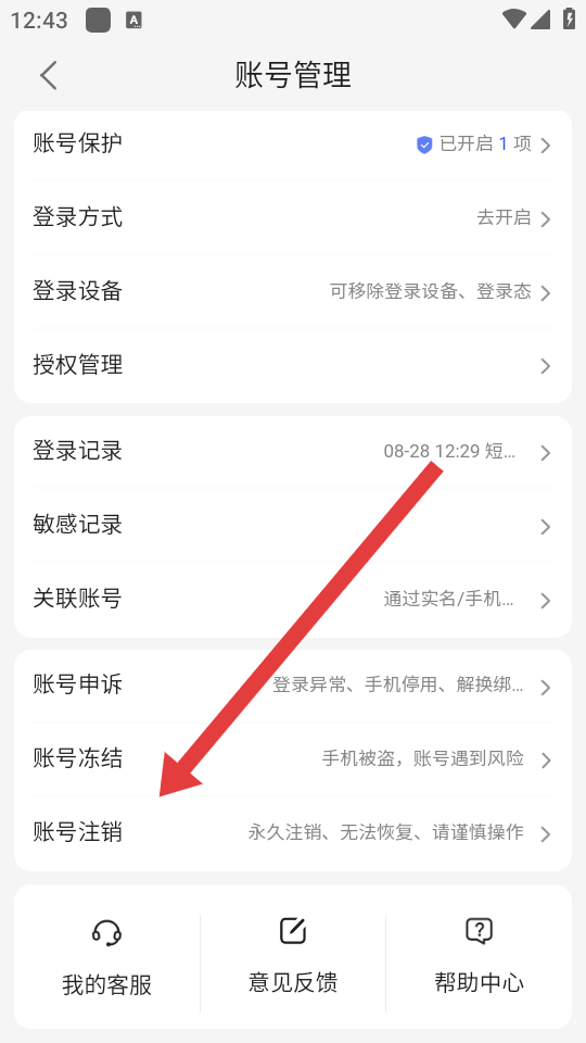 3、在账号管理的页面里,需要滑动查找并点击账号注销选项,后续根据系统提示注销账号。