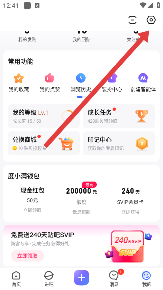 1、打开百度贴吧APP,进入底部导航栏最右侧我的页面,点击页面右上角的设置图标,进入设置界面。
