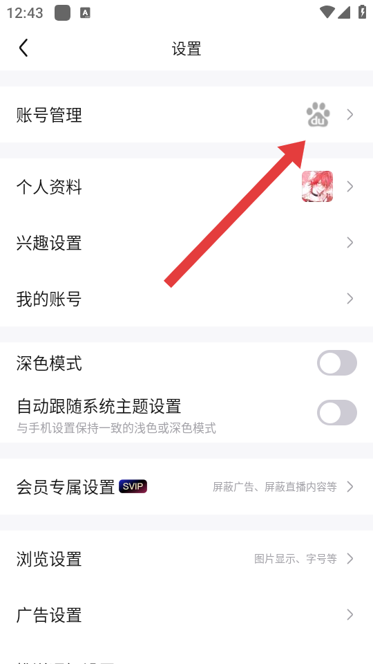 2、在设置界面中,找到并点击账号管理选项,右侧带有百度爪印的图标,进入账号管理的页面。