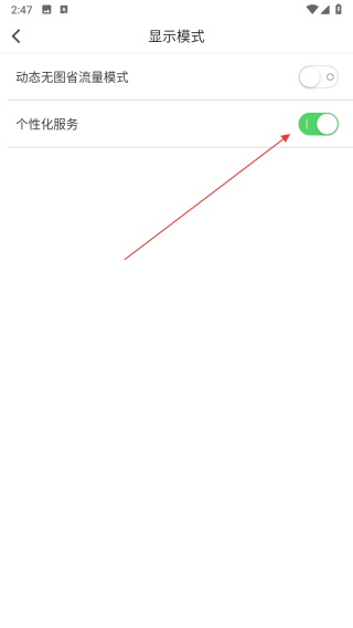 4、在显示模式设置页面,找到个性化服务对应的开关按钮,点击该开关按钮。