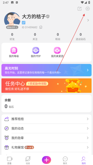 2、在个人页面中,点击右上角的设置图标,进入设置界面。