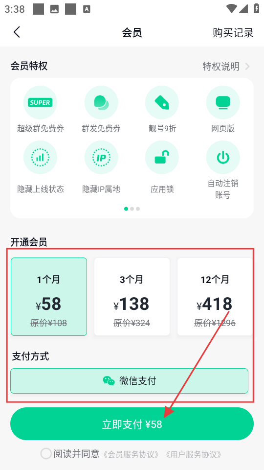 3、在会员页选时长,点立即支付开通会员。