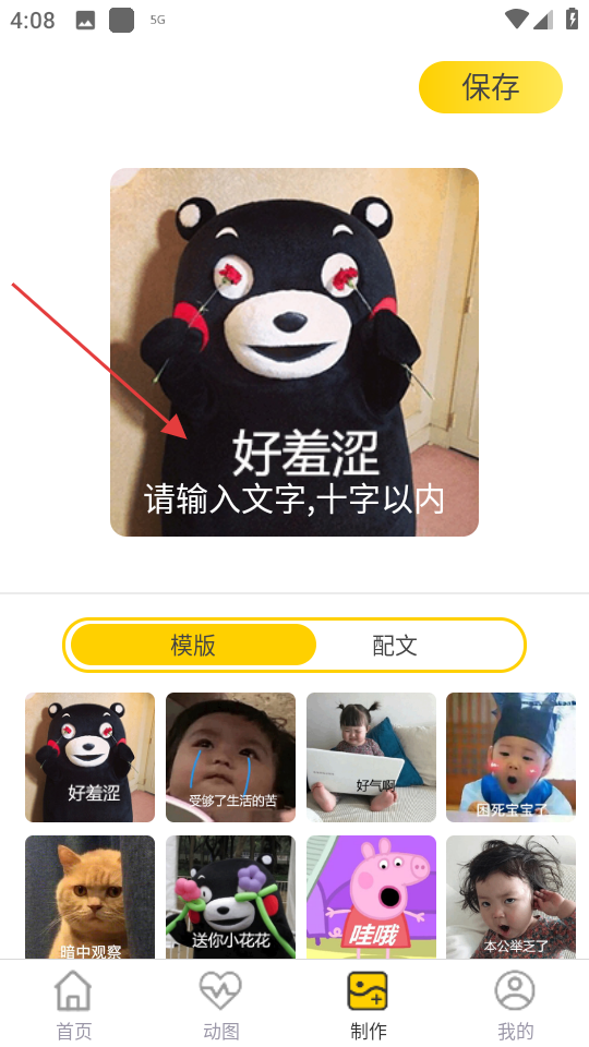 3、用这个功能可以自己DIY专属表情,黑色小熊的模板已经够可爱了,还能加上自己想说的俏皮话,右边有现成的文案可以参考,懒得想就直接用模板里的好羞涩这种现成的梗。