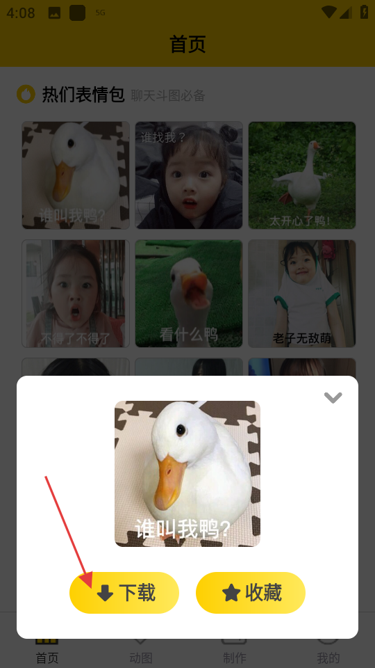 2、看到喜欢的表情直接点下载就能存到手机里,收藏按钮还能把常用的表情归到一起,那个大白鸭的表情特别醒目,配的文字也超有梗,点开大图看着更清楚。