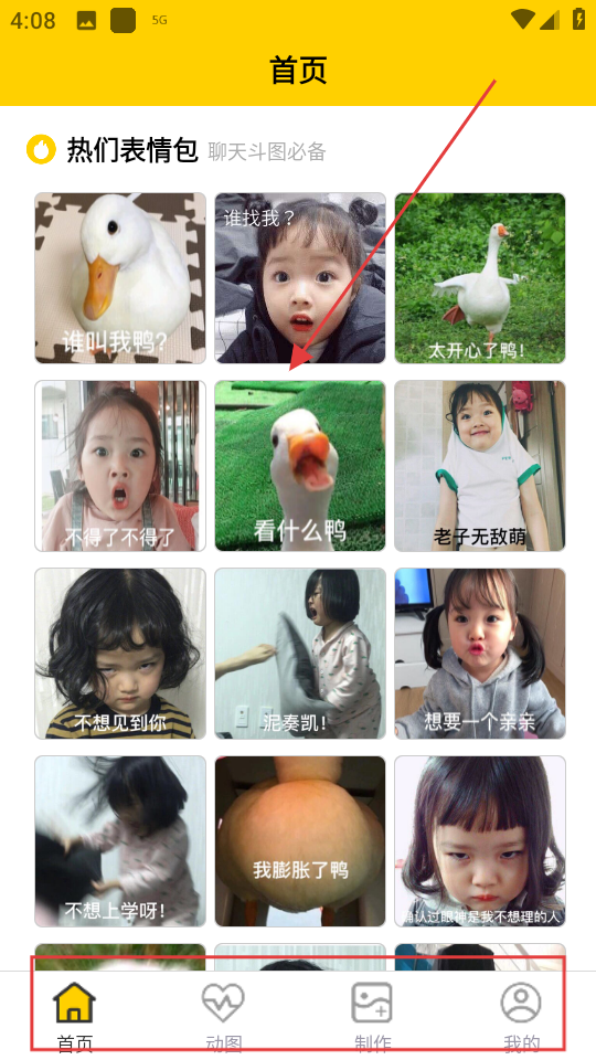 1、首页把所有热门表情包都分类整理好了,想找什么类型都特别方便,最上面那个热门表情包标签会实时更新最火的斗图素材,往下滑还能发现更多有趣的表情组合。