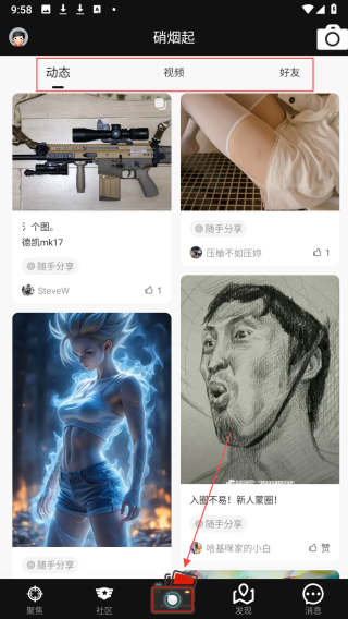 3、点击底部导航栏的发现按钮,可切换上方板块查看各种内容,点击底部导航栏的相机图标,可直接发布自己的动态、视频,分享生活及对相关产品的见解。
