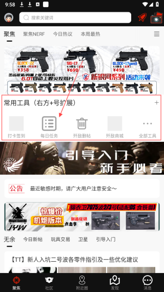 1、打开sdgun应用进入聚焦页面,在常用工具区域,可点击打卡签到获取相应奖励,点击每日任务查看并完成当天任务来积累积分或获取道具,点击右方+号还能扩展更多工具。