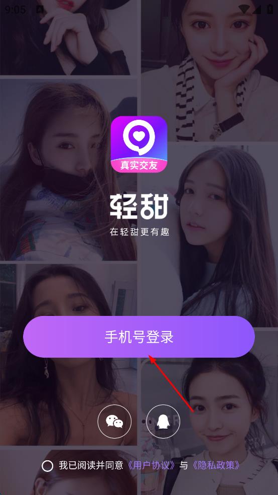 1、打开轻甜软件,在登录选择页面,找到“手机号登录”按钮,点击该按钮,进入手机号登录界面。