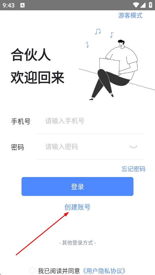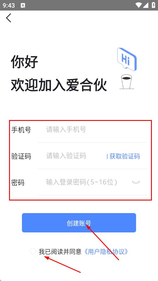 4、输入手机号,填写验证码,设置登录密码,勾选我已阅读并同意用户隐私协议,点击创建账号,完成注册后即可登录。