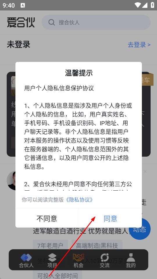 1、打开爱合伙APP,在弹出的用户个人隐私信息保护协议温馨提示框中,点击同意。