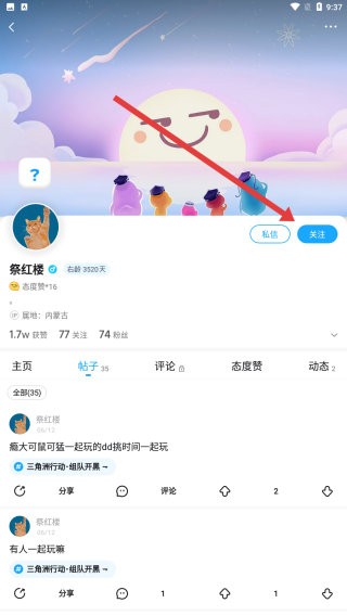 2、在路人的主页里,可以通过点击蓝色的关注按钮关注他。