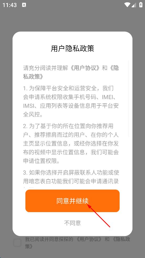 1、打开探探APP,弹出用户隐私政策提示,认真阅读相关内容后,点击“同意并继续”按钮,进入登录界面。