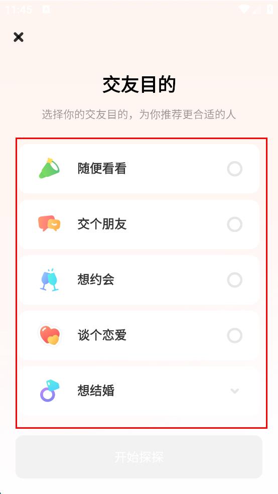 4、设置好性别后,进入交友目的选择页面,在“随便看看”“交个朋友”“想约会”“谈个恋爱”“想结婚”等选项里,挑选符合自己交友需求的目的。