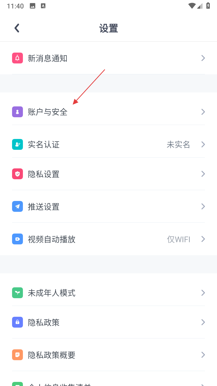 3、在设置界面,点击账户与安全选项,进入账户安全页面。