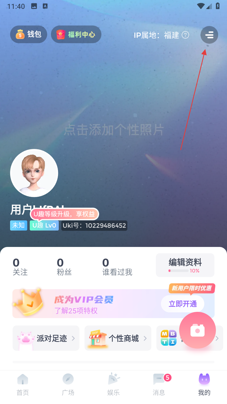 1、打开Uki APP,进入我的页面,点击右上角三条横线图标,展开侧边栏。