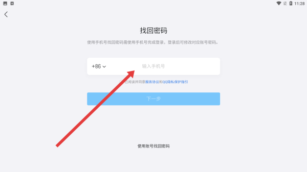 3、成功切换后,点击输入框输入手机号,逐步完成找回密码操作。
