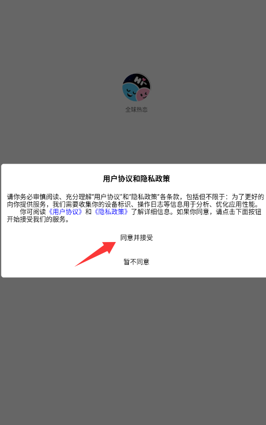 1、几点用户协议和隐私政策里的同意并继续。