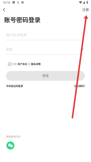 3、在账号密码登录页面中,若没有账号可点击右上方注册按钮,进行注册。