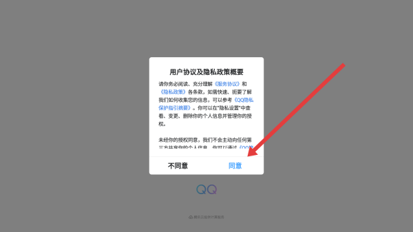 1、通过点击弹窗中的同意按钮,同意用户协议后进入qq。