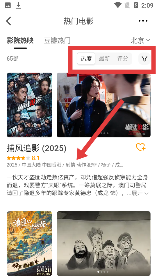 3、进入热门电影页面后,可依据热度、最新、评分等条件对电影进行排序筛选,点击感兴趣的电影封面或标题,就能查看更多信息。