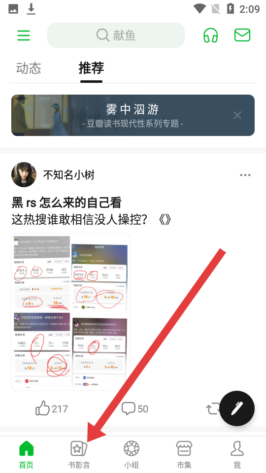 1、打开豆瓣APP之后,点击底部导航栏中第二个书影音图标,即可进入书影音界面。