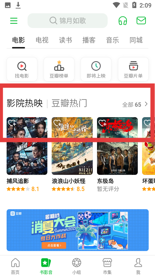 2、在书影音界面中,找到影院热映或豆瓣热门区域,这里展示了当下的热门电影,点击全部能查看更多电影。