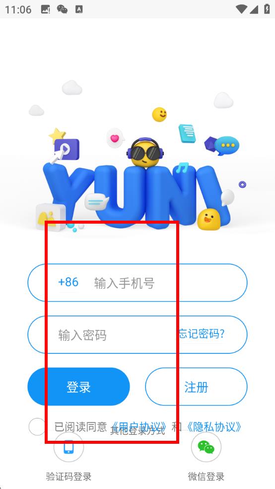 3、确认信息无误,点击登录,若未注册会跳转注册流程;也可选择验证码登录、微信登录等方式,完成账号登录,开启YUNI使用之旅。