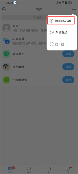 2、接着会出现一个小弹窗,点击添加朋友/群;