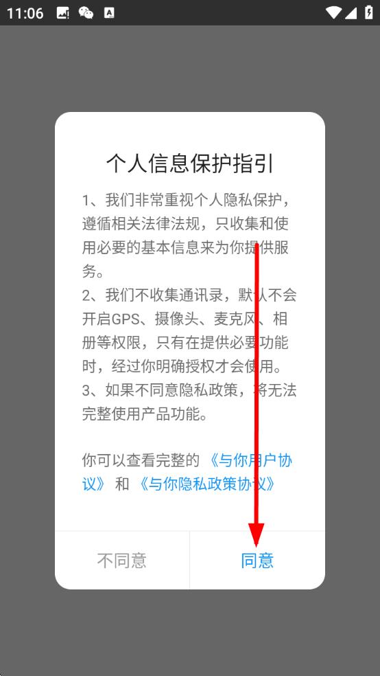 1、首次打开YUNI,阅读个人信息保护指引,点击同意,进入应用体验流程。