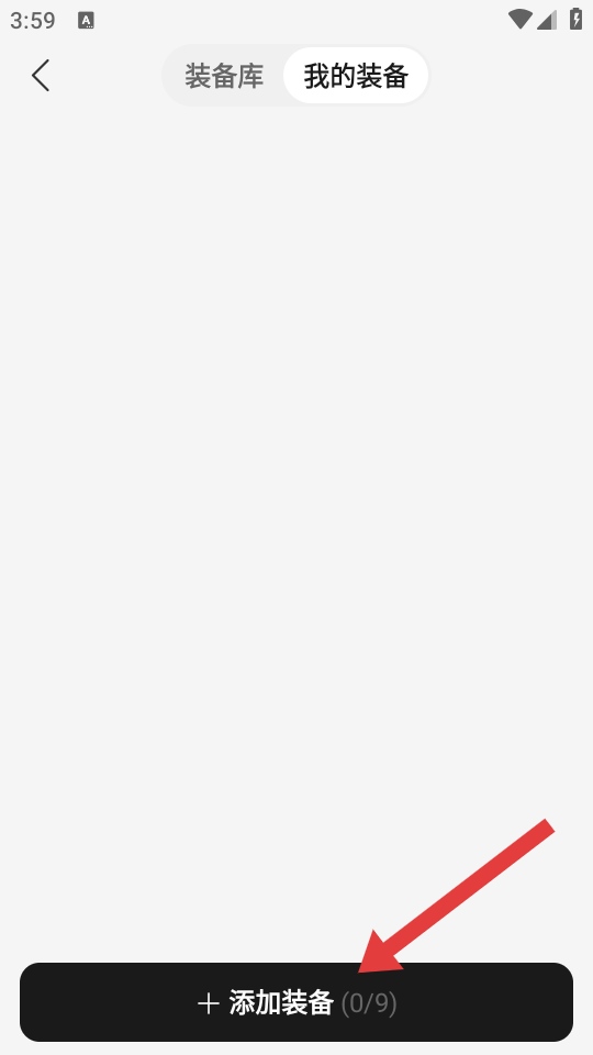 2、在我的装备界面,点击底部的+添加装备0/9按钮,进入装备库页面。