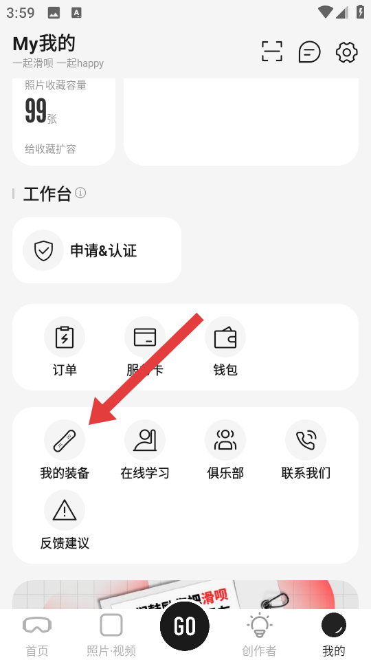 1、在滑呗我的页面,点击我的装备的选项,进入我的装备界面。