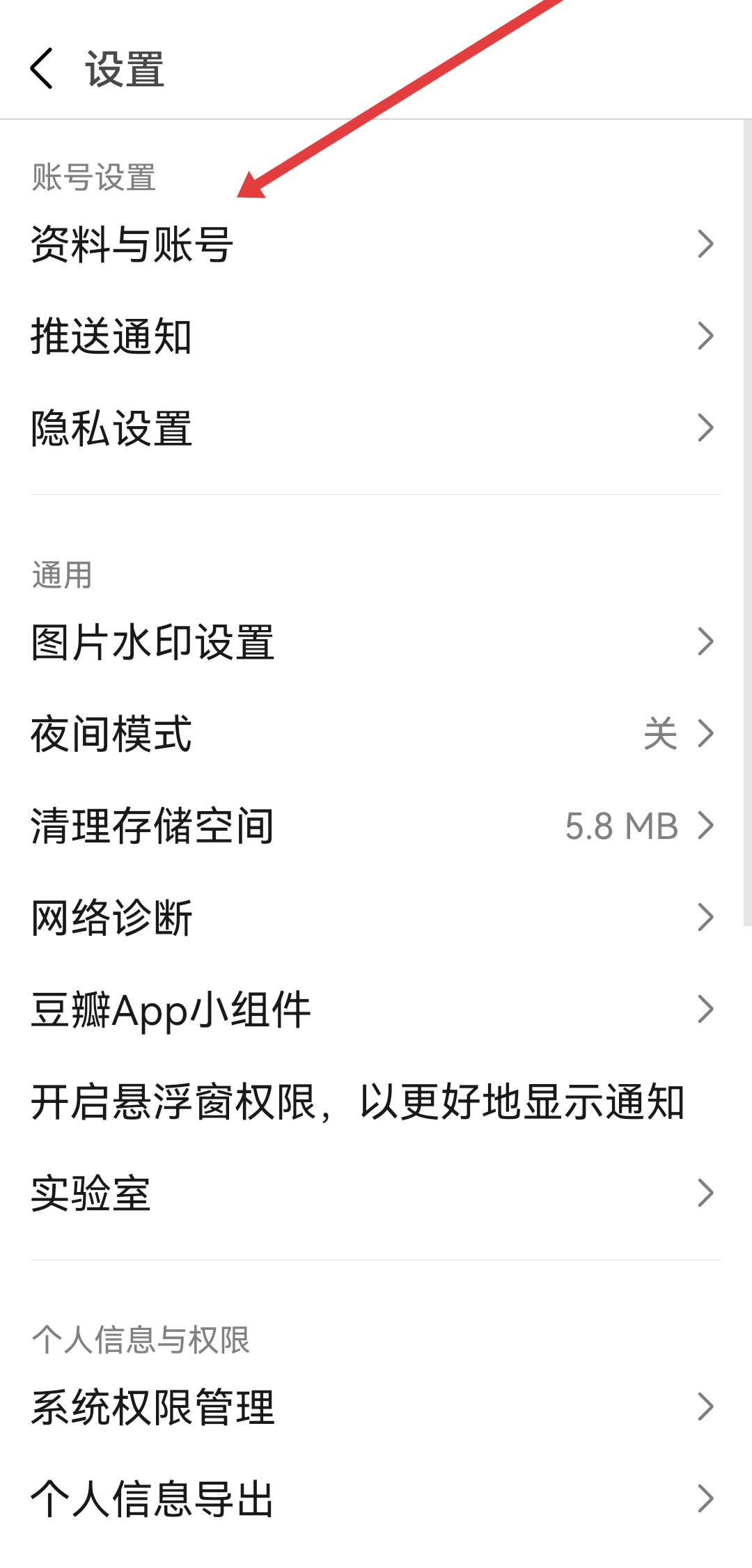 1、打开豆瓣APP,进入个人的设置页面后,需要点击资料与账号选项,进入资料与账号的设置界面。