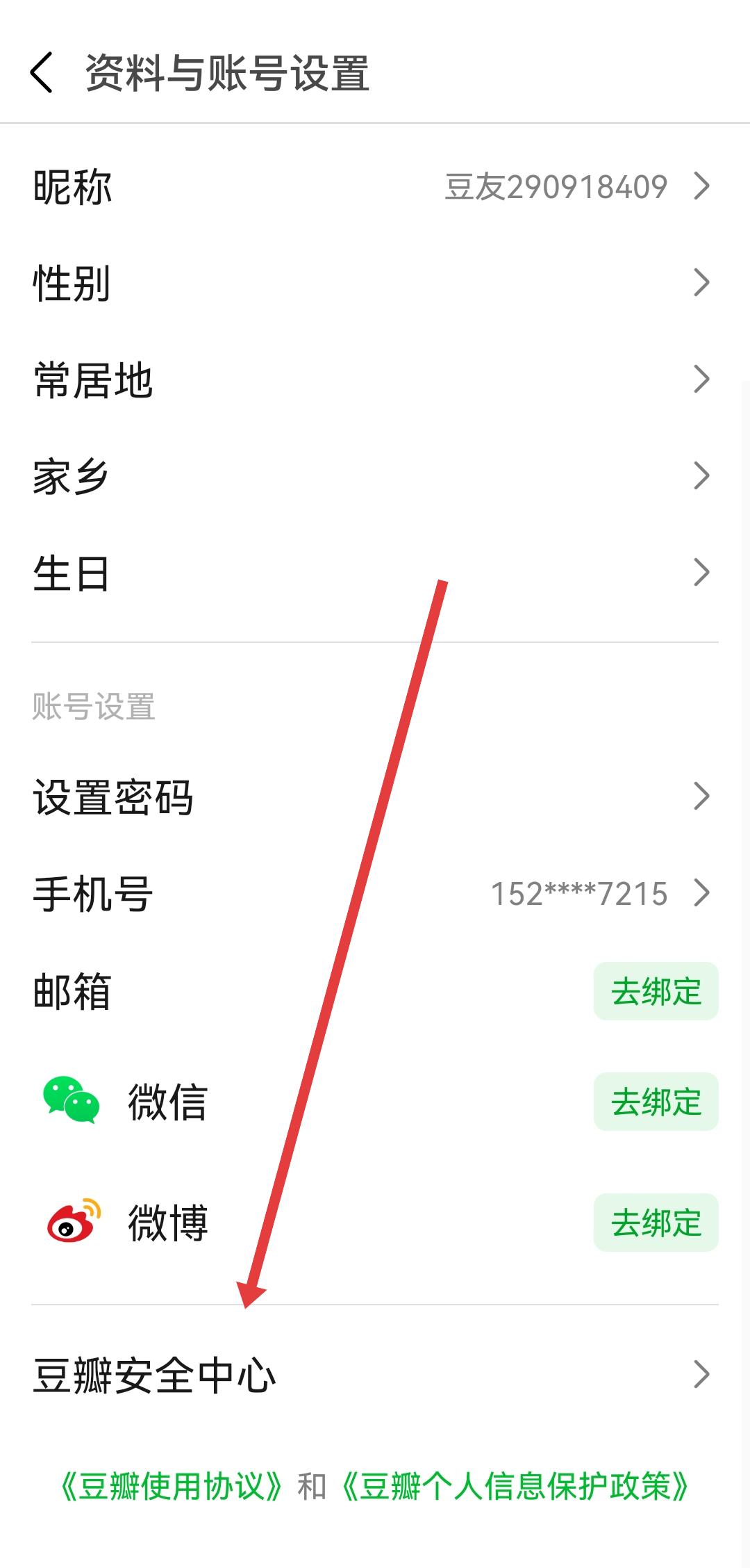 2、在资料与账号设置页面中,滑动至底部找到豆瓣安全中心选项并点击,进入安全中心的页面。