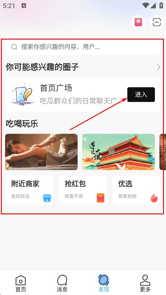 1、打开软件后,浏览推荐的兴趣圈子,找到感兴趣的旅行圈、广场舞圈等,点击加入即可进入圈子,查看圈友分享的内容。