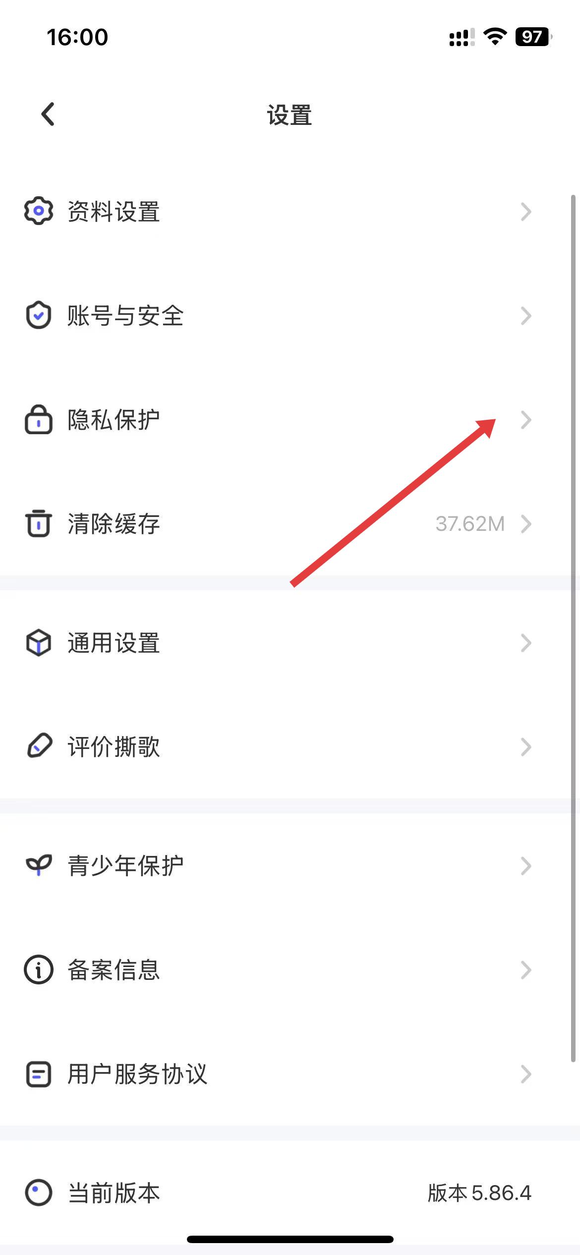 2、进入设置界面,找到隐私保护选项,点击其右侧箭头,进入隐私保护设置页面。