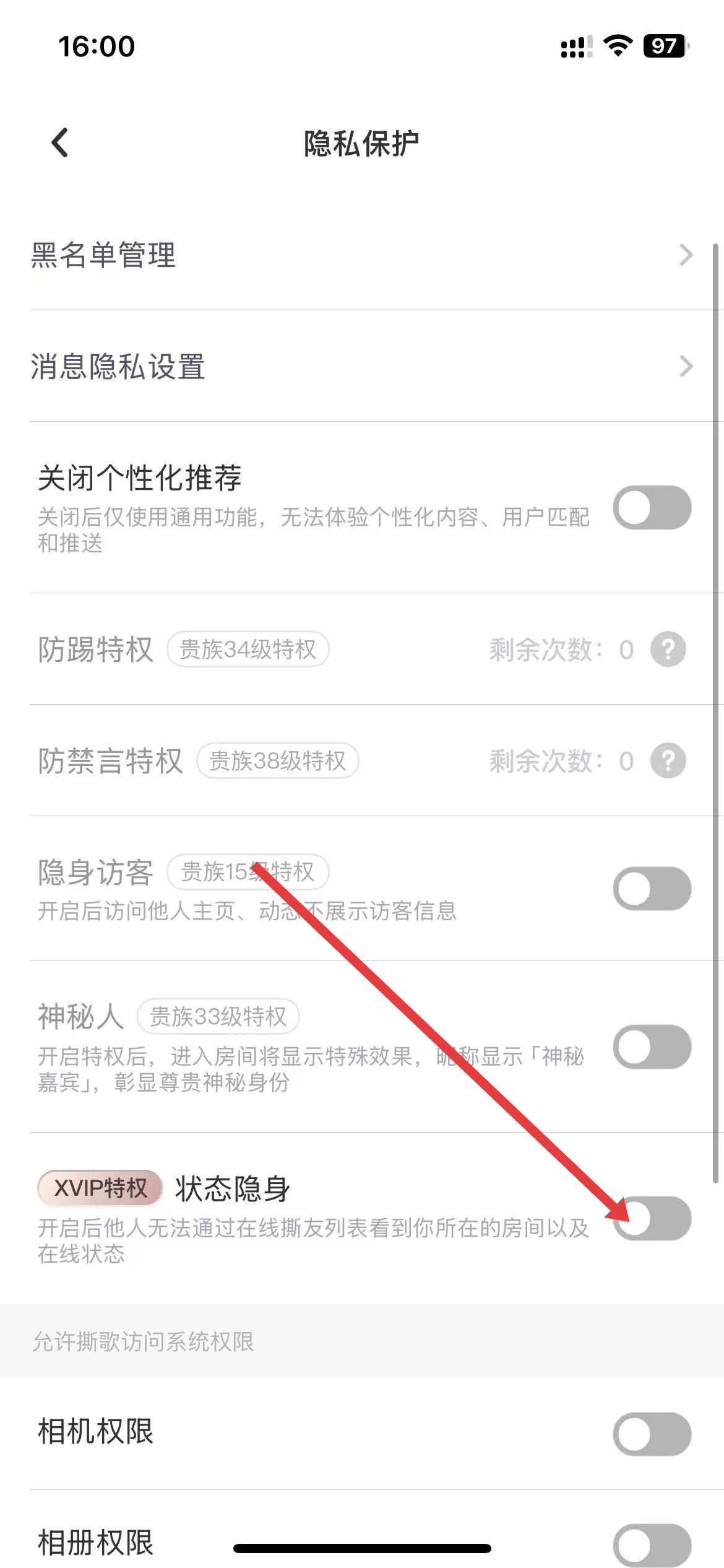 3、在隐私保护页面,找到状态隐身选项,点击其右侧开关按钮,开启后即可隐身。